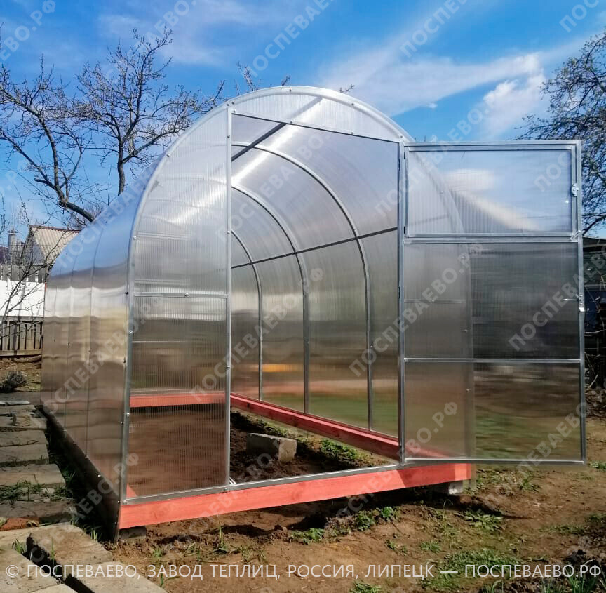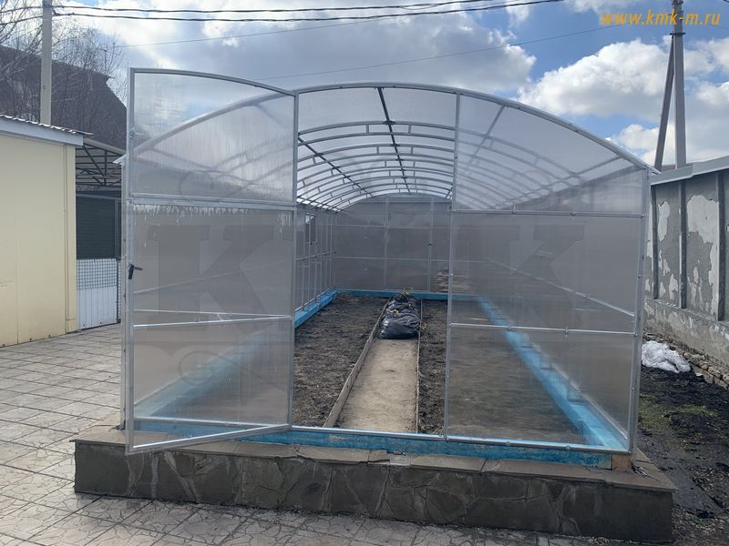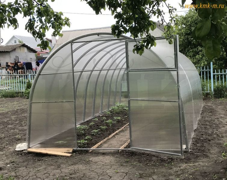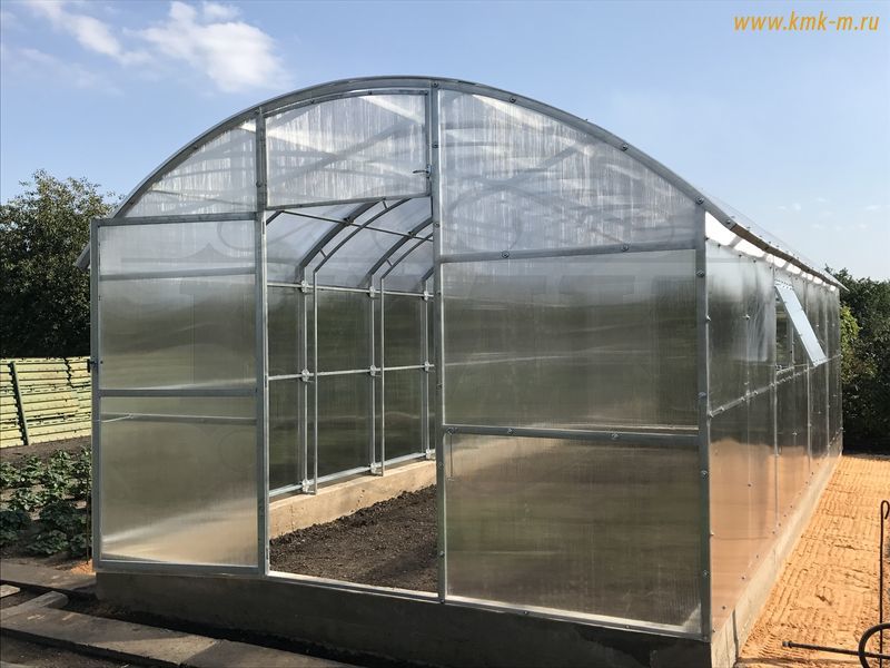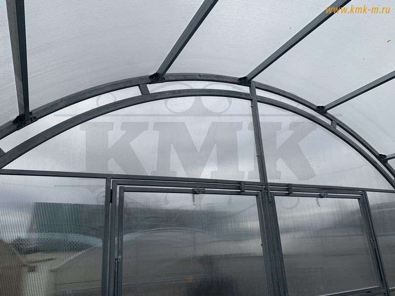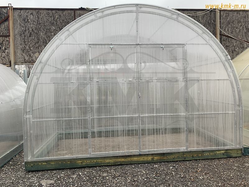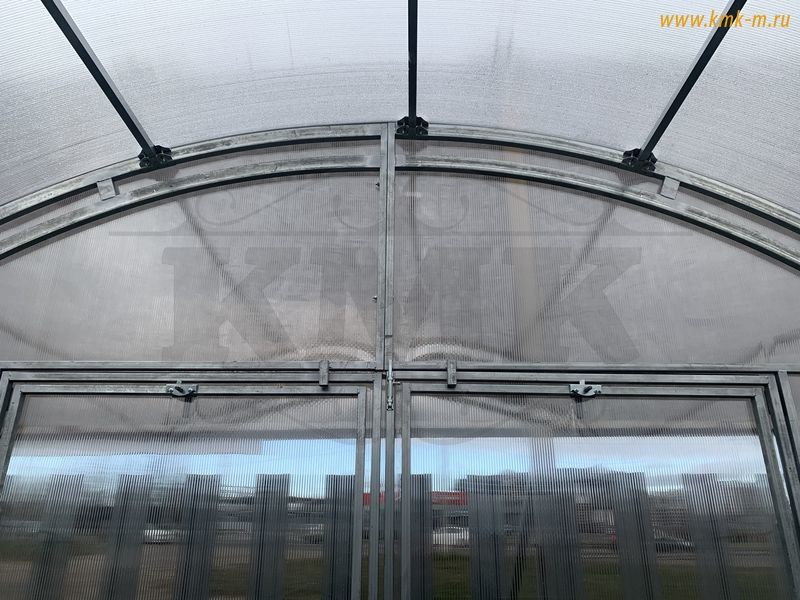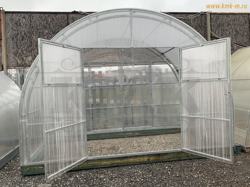 Изделие комплектуется качественным и долговечным сотовым поликарбонатом. Представленная теплица имеет большие двустворчатые двери (в одной из воротин имеется отдельная калитка) в каждом торце; полностью совместима с дополнительными форточками, системами автопроветривания и автополива.