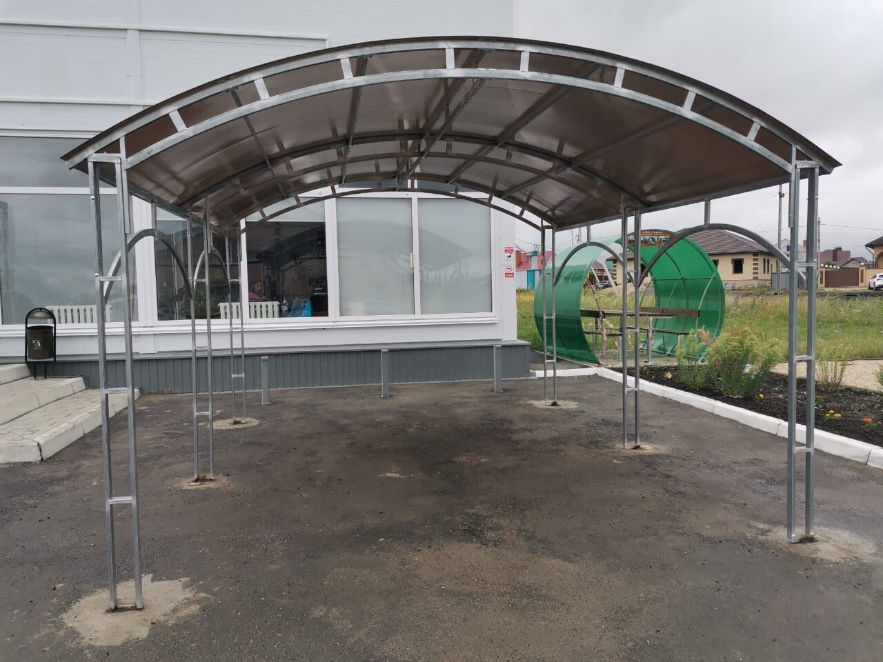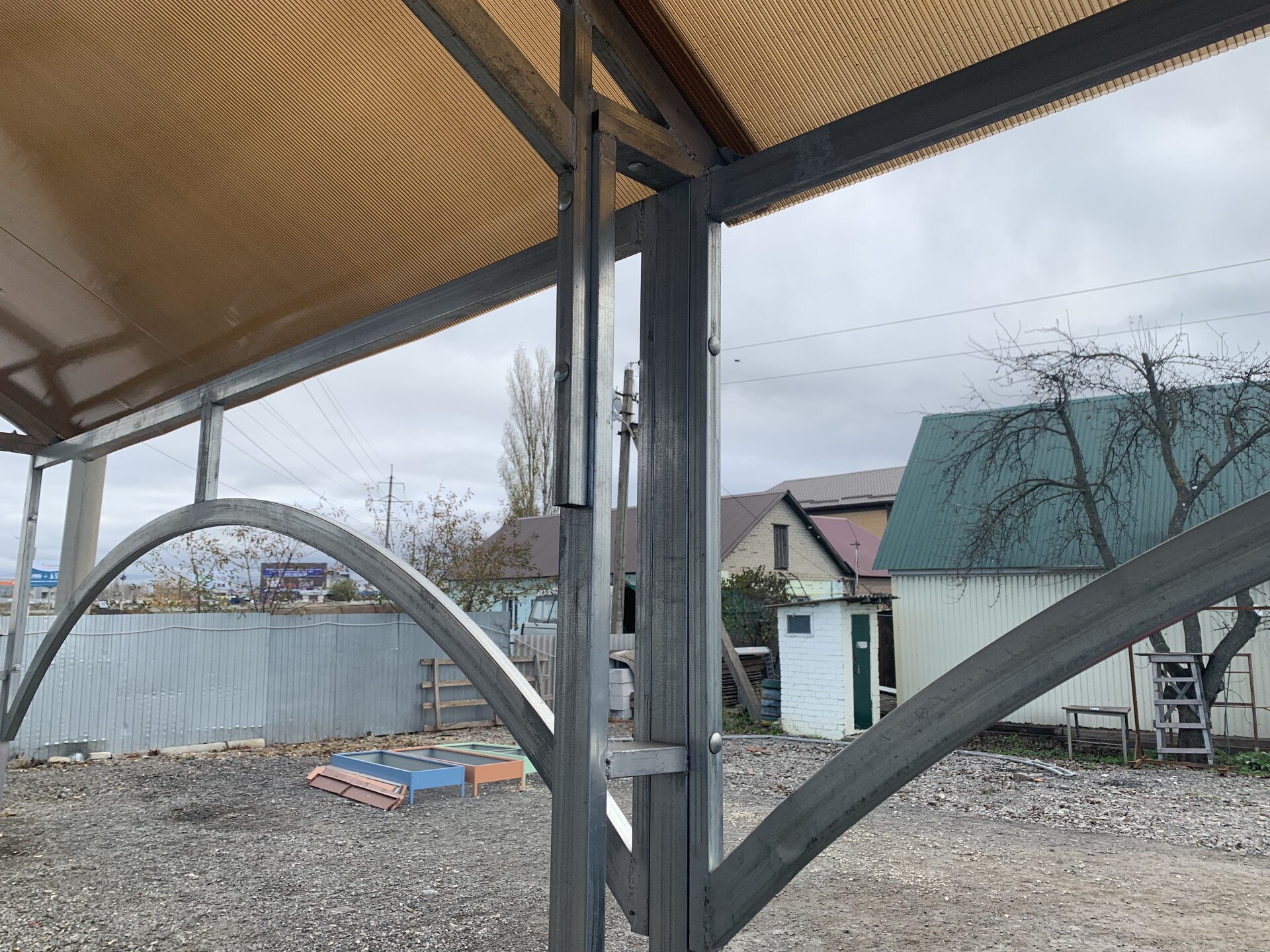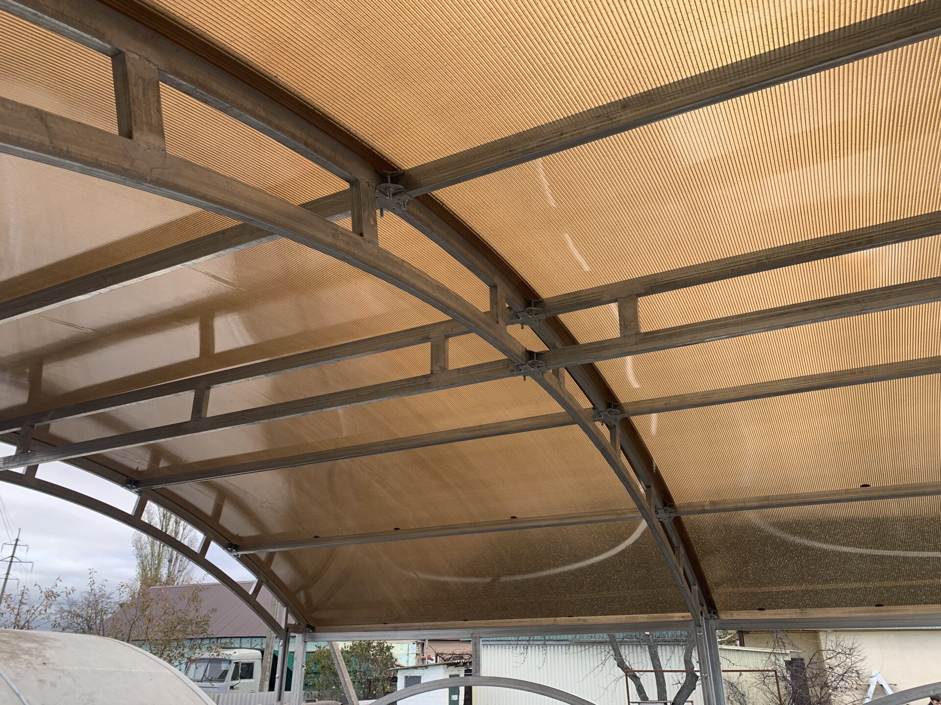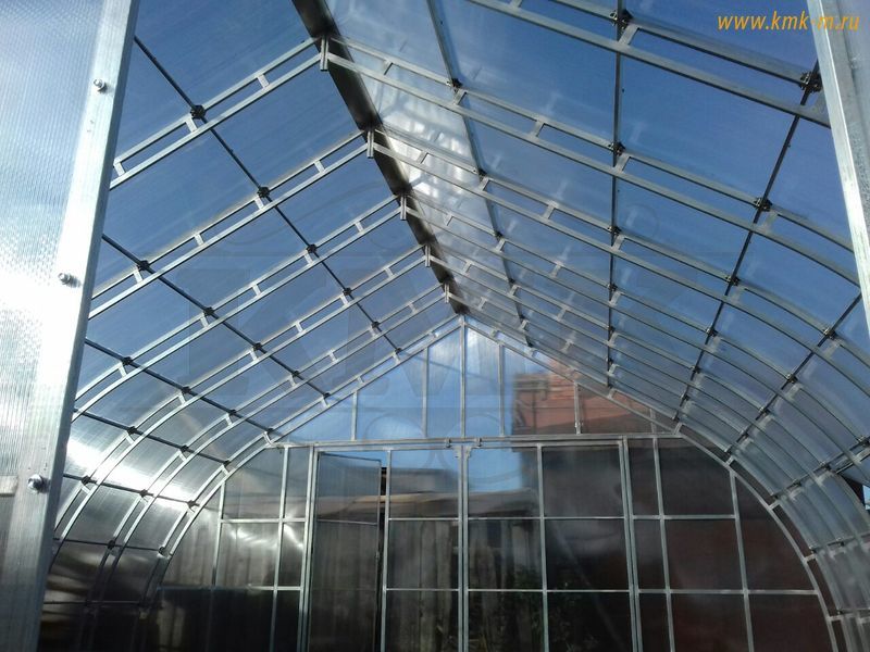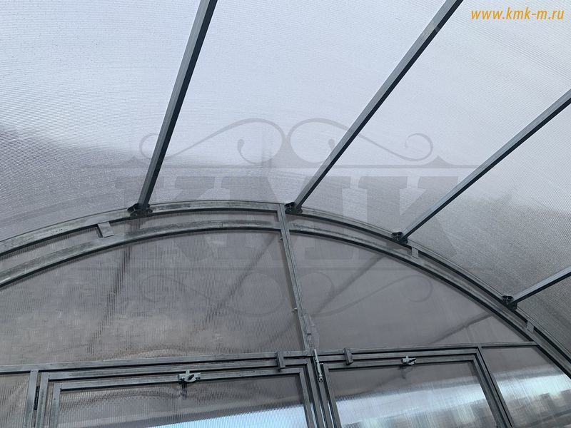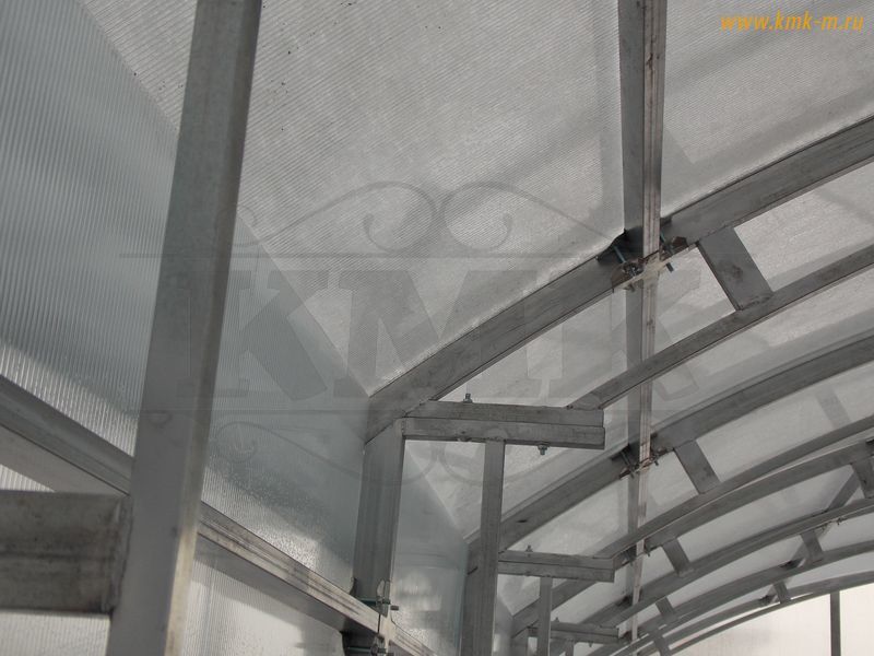 Перемычки между дугами лежат в одной плоскости с дугой. Таким образом уменьшается нагрузка на поликарбонат, он не заламывается и продлевается срок службы дорогостоящего материала.